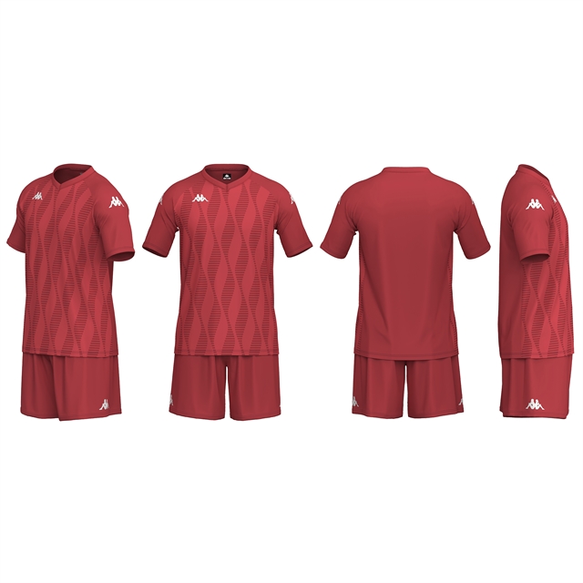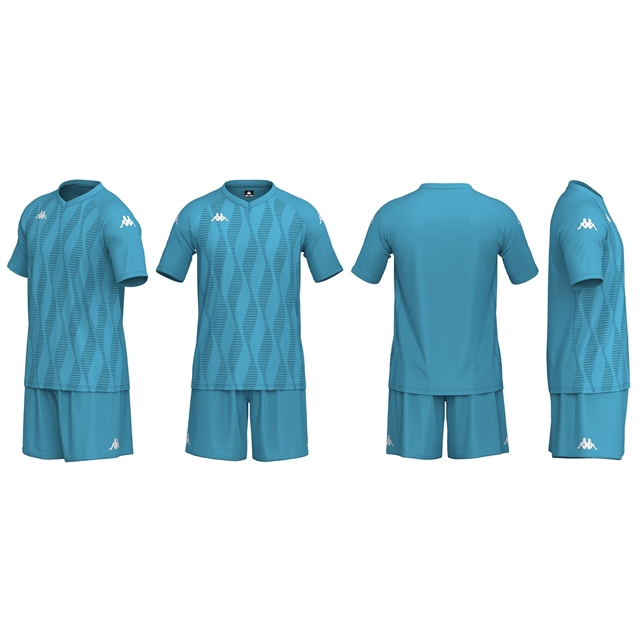 100% polyester. Short sleeve shirt and waist elastic with inner drawcord. Printed Kappa Lettering on top and shorts and printed Omini Logo on top and shorts.