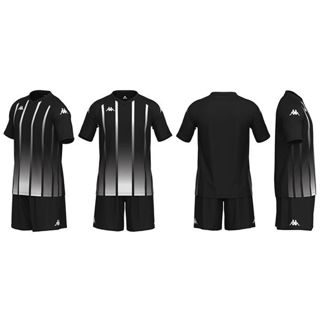 100% polyester. Short sleeve shirt and waist elastic with inner drawcord. Printed Kappa Lettering on top and shorts and printed Omini Logo on top and shorts.