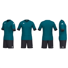 100% polyester. Short sleeve shirt and waist elastic with inner drawcord. Printed Kappa Lettering on top and shorts and printed Omini Logo on top and shorts.