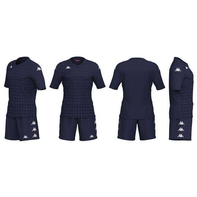 100% polyester. Short sleeve shirt and waist elastic with inner drawcord. Printed Kappa Lettering on top and shorts and printed Omini Logo on top and shorts.
