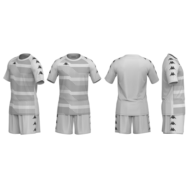 100% polyester. Short sleeve shirt and waist elastic with inner drawcord. Printed Kappa Lettering on top and shorts and printed Omini Logo on top and shorts.