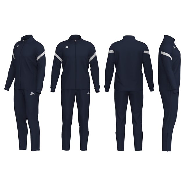. 100% polyester. Front opening with zip, zips on top pockets and opening on both lower legs with zips, elasticated borders. Embroided Kappa lettering and printed Omini logo on top and pants.