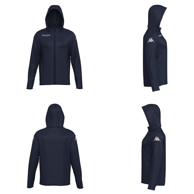 Training windbreaker in woven fabric. Regular fit. Hooded, full zip opening, pockets with zips and elastic bonding on cuffs. Kappa lettering on front and Omini logo on sleeves embroided.